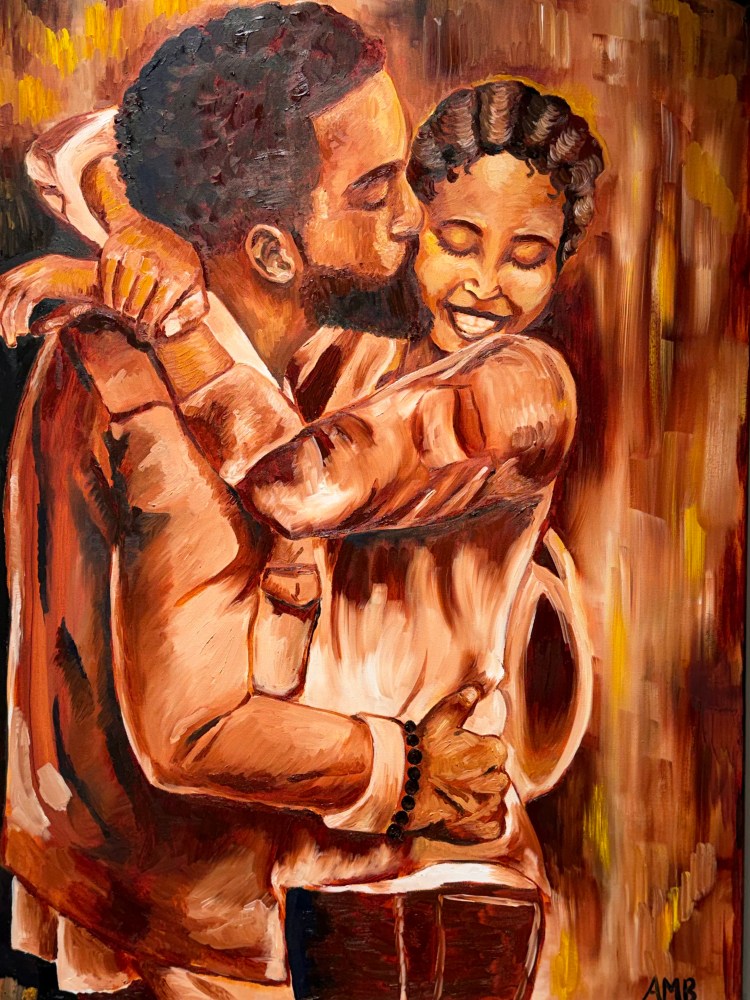 Her first series is titled, “A Return to Love.” The first painting of this series, which was awarded First Place and Best of Show in the South San Francisco Cultural Arts Program’s 2026 What is Love Exhibit, is titled, “Embraced: A Return to Love.” It captures the joyous expression of love in our faces and body composition. Love lights up the mind and expresses its presence through movement and stillness. The figures in the painting represent a core requirement of love. That is giving starts with receiving.